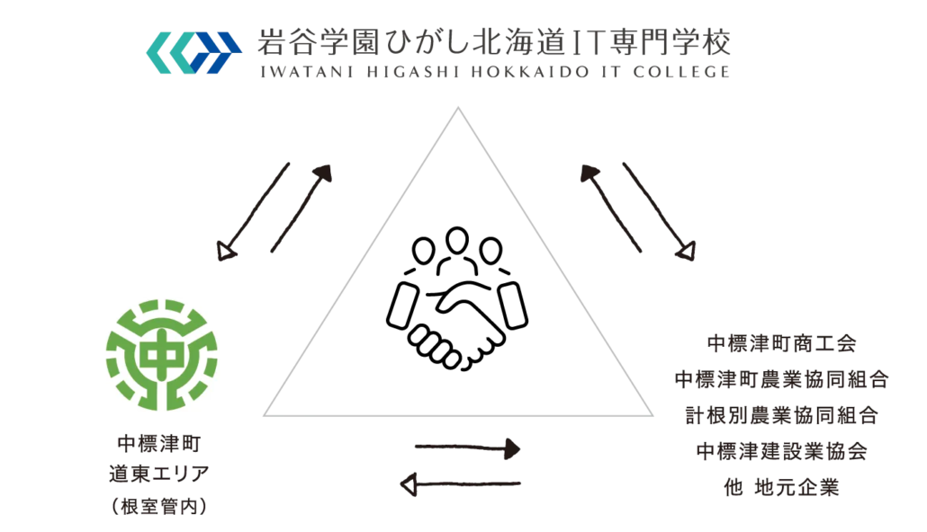 岩谷学園、中標津町(道東:根室管内)、地元企業が三位一体となり、地域の未来を支える実践的な学びを提供しています。学生は道東エリアをキャンパスとし、地域や産業が直面する課題に取り組むことで、ITやリーダーシップを実践的に学びます。この協力体制により、持続可能な社会を創る次世代のリーダーを育成し、地域活性化と未来の産業づくりに貢献しています。
